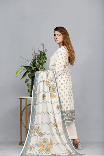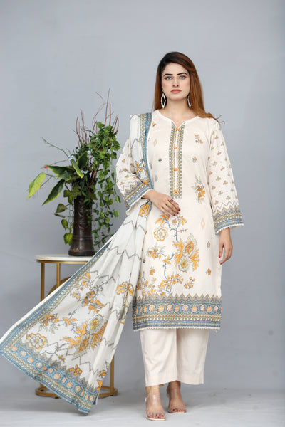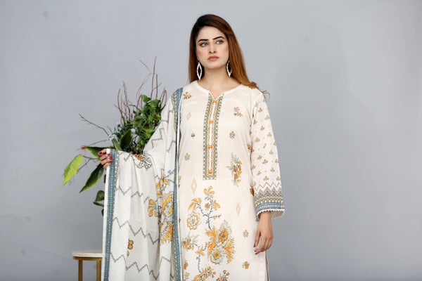 Create a festive impression with our three-piece stitched printed lawn suit.